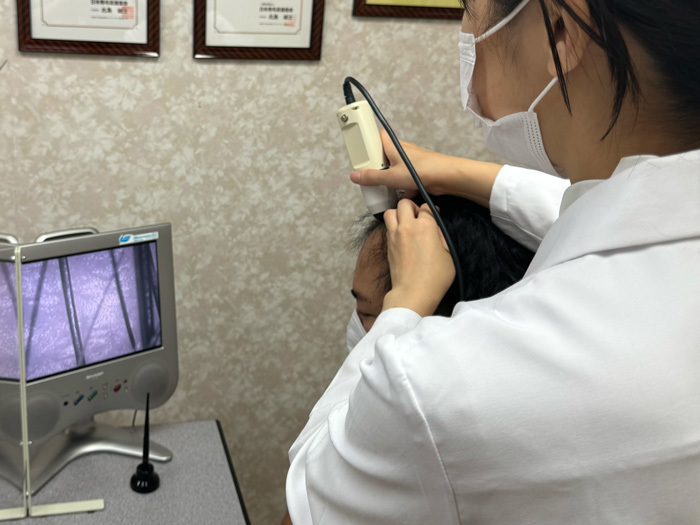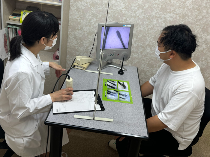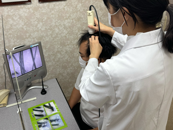200倍のスコープを使って頭皮と毛根の状況を確認して、